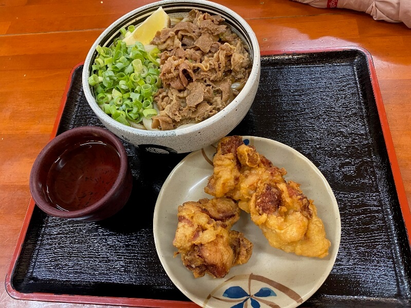 Our family ordered three bowls in total — all hot pork broth udon. It’s a self-service restaurant, so we poured our own tea. The udon came in huge bowls, topped with generous amounts of pork. A splash of lemon juice, and it was ready to eat.
